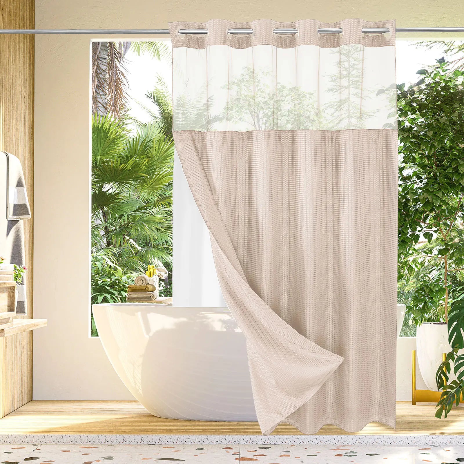 Enjoy the convenience of a built-in waterproof liner that shields your curtain from moisture and mildew, saving you from the hassle of hanging and washing a separate liner.