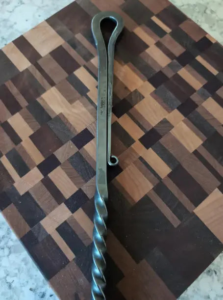 The tumbler was made by a blacksmith in Buffalo, Wyoming. This is a great tool for flipping steaks or any other meat on the grill. Nice iron loop at the end creates a great grip. Length is approximately 16 inches and is the default option. The iron is heated to 300-400 degrees and then soaked in cooking oil. This allows the metal pores to open and soak in the oil. This helps prevent rust